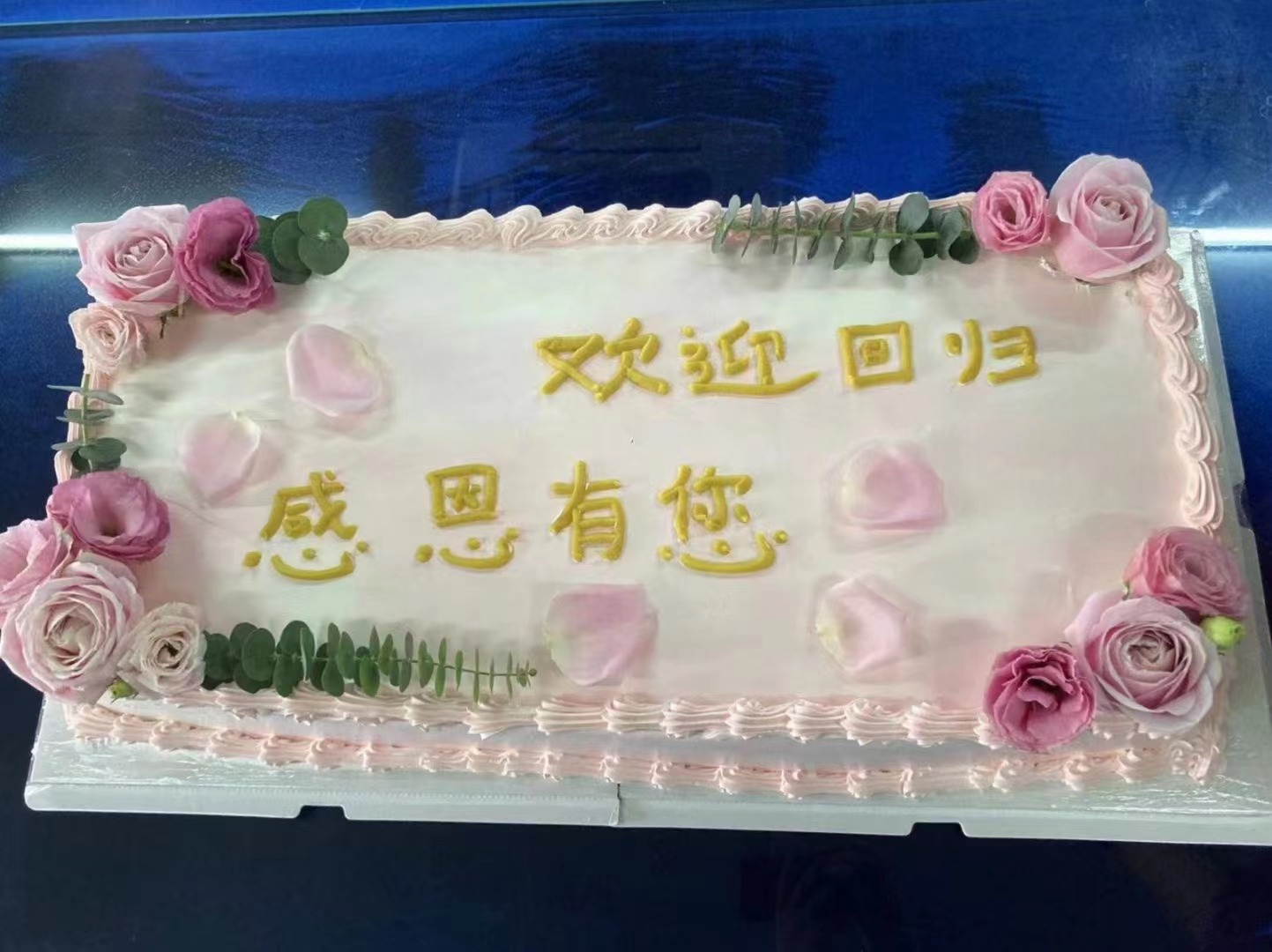 为了表达同事们的心意,大家准备了鲜花、蛋糕,为董事长归来接风。在此,特别祝愿:铭锋未来更美好!